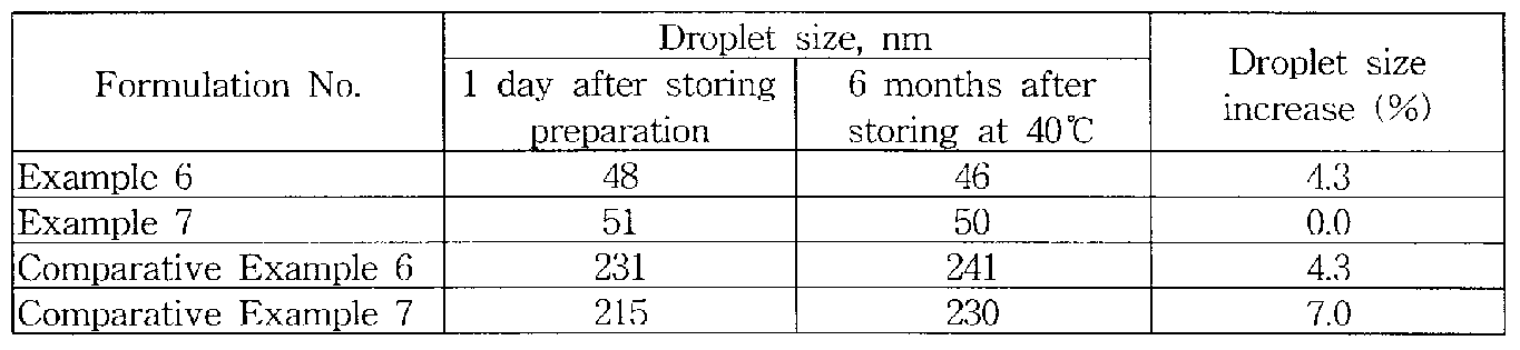 On the other hand the mean droplet diameter of nanoemulsion compositions of Comparative Examples 6-7 was in the range of 215 to 231 nm, which is larger than that of Examples 6-7 by 182 nm In the evaluation of stability b> measuring the mean droplet diameter after storing for 6 months at 40 °C the increase (%) of the mean droplet diameter of compositions of Examples 6-7 in this invention was 1 1%, which is much