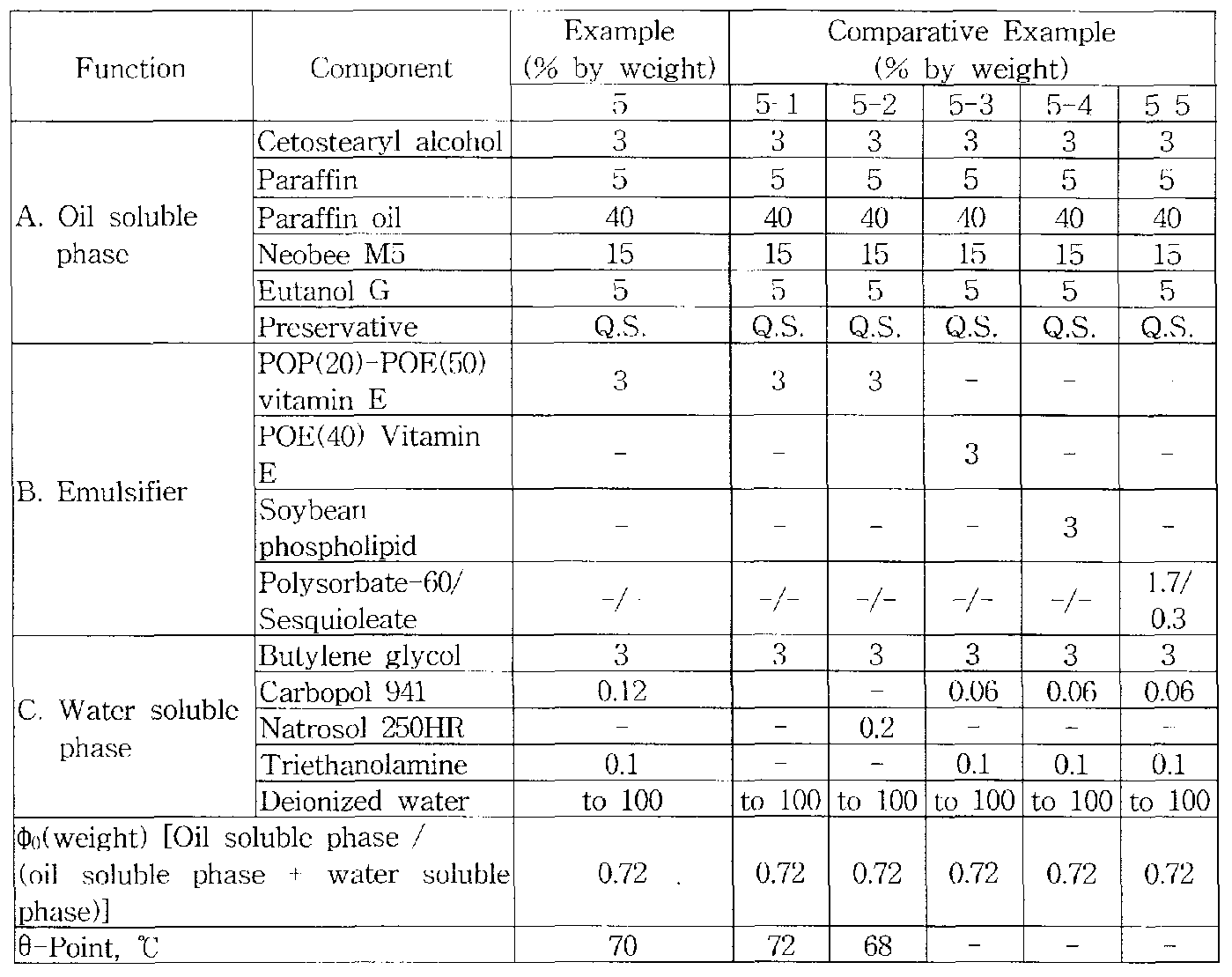 According to the compositions in Table 4, oil soluble phase and emulsifier were poured into the manufacturing tank followed by heating them to 50°C and the dispersed water soluble phase preheated to 50°C was added. The o/w nanoemulsion cosmetic base composition in Example 5 was prepared by the emulsification method using a high speed disperscr mixer (ca. 1,000-8,000 RPM) at 1 atmospheric pressure after confirming the formation of high viscosity complex at Θ-point by stirring slowly on heating the mixtures of oil soluble phase with emulsifier and water-soluble phase and cooling down to RT. Those of Comparative Examples 5-1 , -2, -3, -4, -5 in Table 4 were prepared by the same method employed in Example 5. [Table 4]