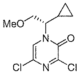 (5)-3 , 5 -dichloro- 1 -( 1 -cyclopropyl-2-methoxyetrryl)pyrazin-2( 1 /-/)-one [16O g, 90-95% of the (5)-enantiomer] from various batches was processed by Thar SFC to isolate the (S)-enantiomer in >99% enantiomeric purity. A total of 133g of (5)-3,5- dichloro-l-(l-cycloρropyl-2-methoxyethyl)pyrazin-2(lH)-one was isolated in 3 batches. 11.8 g of the imdesired isomer was also obtained. The enantiomeric excess (ee) of the compounds delivered were >99%. Preparative conditions on Thar 350 SFC were as follows: amount racemate (g): 65, 58, 37; column: Chiralpak AD-H, 5x25 cm; mobile phase: 10% EtOH in CO2; pressure (bar): 100; flow rate (ml/ min): 200; solution concentration (mg/ml): 50; injection amount (ml): 6; Cycle time (min/inj): 3.5; temperature: 35; throughput (g/ hr): 5.1 ; Detector λ: 220.