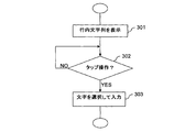 - the information processing terminal 10 selects a line of the representative character specified by the tap operation (step 105), The characters are displayed concentrically with the representative character row in a line on the inner arc (step 106). For example, when a tap operation is performed on “A” in the representative character string 23 as shown in FIG. 4D, the in-line character string 24 “A”, “I”, “U”, “E” of that line as shown in FIG. 4E. "" Is displayed on the inner arc. In the figure, the tap operation is indicated by a hatched ellipse.