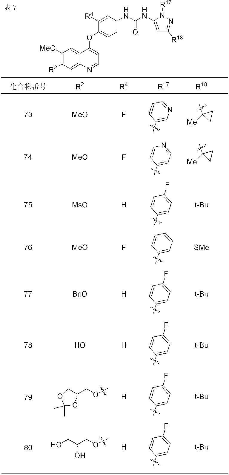- kinase inhibitors containing quinoline derivatives having an aromatic heterocyclic urea structure are known (see Patent Documents 1 to 10). Also known are kinase inhibitors containing a quinoline derivative having a pyrazolourea structure (see Non-Patent Documents 1 to 3).