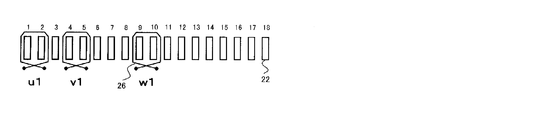 - addresses U1 to U8 are assigned in order clockwise to the teeth 22 around which the U-phase stator coil 26 is wound. Similarly, with respect to the teeth 22 around which the V-phase stator coil 26 is wound. Thus, addresses from V1 to V6 are assigned, and further, addresses from W1 to W5 are assigned to the teeth 22 around which the W-phase stator coil 26 is wound. In the stator 14 shown in FIG. 1, there are five teeth 22 to which the address of the stator coil 26 is not attached.