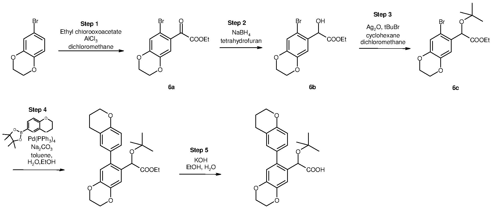 A degassed solution of ethyl 2-(ferf-butoxy)-2-{2-[(trifluoromethane)sulfonyloxy]-6- (trifluoromethyl)phenyl}acetate (33f) (70 mg, 0.15 mmol), potassium carbonate (86 mg, 0.62 mmol), 6-(4,4,5,5-tetramethyl-1 ,3,2-dioxaborolan-2-yl)chroman (52 mg, 0.20 mmol) and palladium tetrakis(triphenylphosphine) (18 mg, 0.02 mmol) in dioxane (1 mL) and water (0.25 mL) was heated at 85 °C for 16 hours. Water (3 mL) was added and the mixture was extracted with ethyl acetate (2x5 mL). The organic layer was washed with brine (5 mL), dried over sodium sulfate and concentrated in vacuo. The residue was purified twice by preparative TLC (cyclohexane/ethyl acetate 95/5 then 80/20) to provide ethyl 2-(ferf-butoxy)-2-[2-(3,4-dihydro-2H-1 -benzopyran-6-yl)-6- (trifluoromethyl)phenyl]acetate (33g) (49 mg, 0.1 1 mmol, 72%) as a colorless oil. 1 H NMR (300 MHz, CDCI3) 0.93 (s, 9H), 1 .25 (t, J = 7.2 Hz, 3H), 2.02-2.07 (m, 2H), 2.78 (t, J = 6.4 Hz, 2H), 4.17-4.25 (m, 4H), 5.23 (s, 1 H), 6.81 (d, J = 8.4 Hz, 1 H), 7.04-7.09 (m, 2H), 7.36-7.43 (m, 2H), 7.69 (dd, J = 2.1 Hz, J = 7.3 Hz, 1 H).