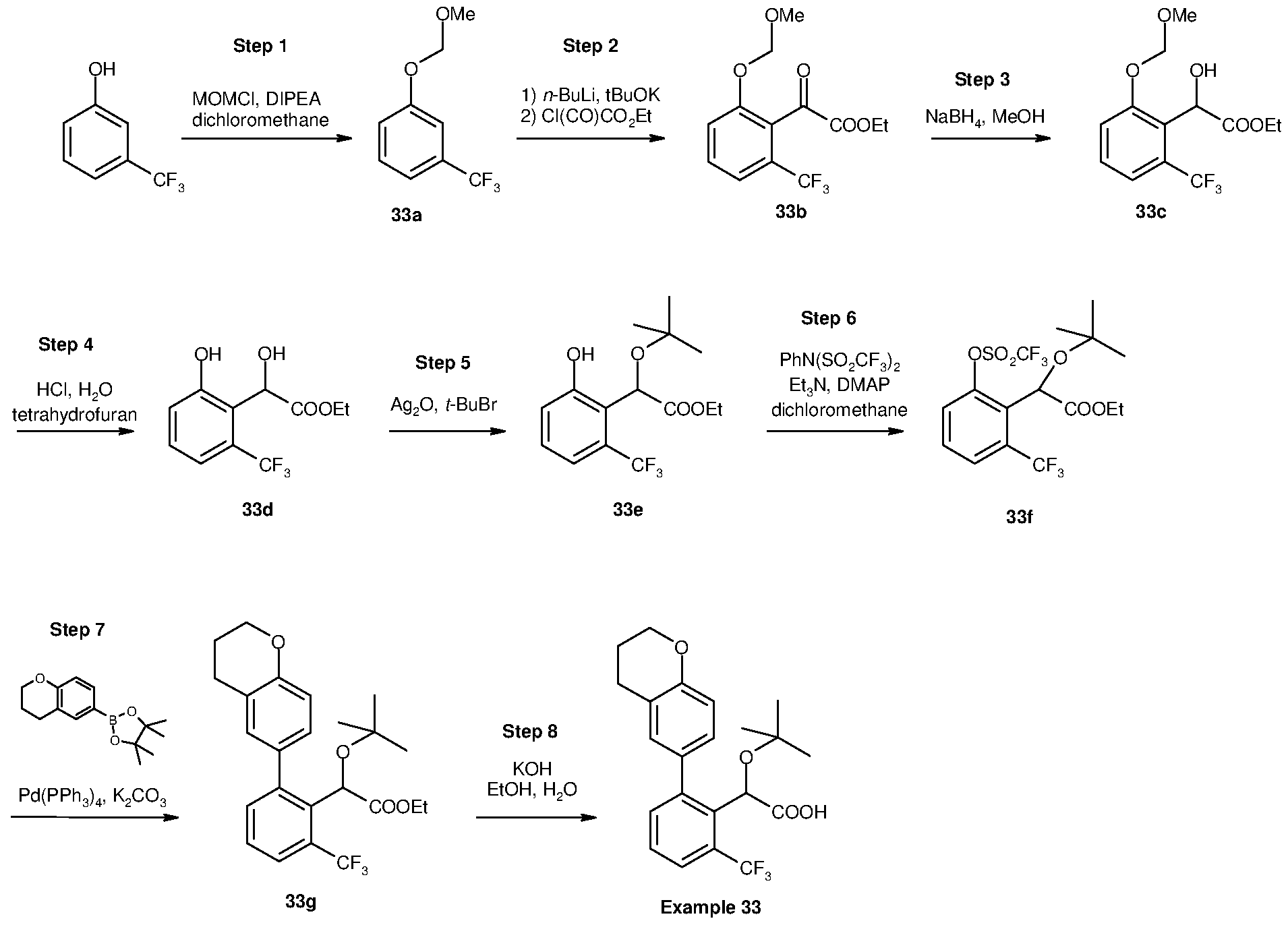 MS m/z ([M-H]-) 371 . Example 33 : Synthesis of 2-(te/ -butoxy)-2-r2-(3,4-dihvdro-2H-1 -benzopyran-6- yl)-6-(trifluoromethyl)phenvnacetic acid