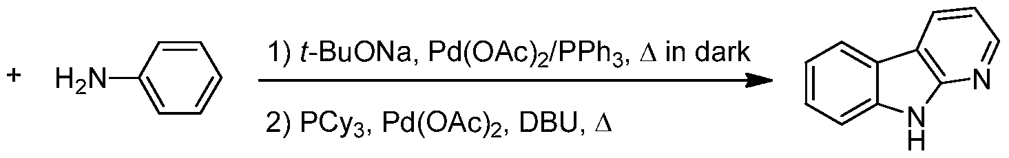 [0111] Into a mixture of sodium tert-butoxide (11.69 g, 122 mmol), triphenylphosphine (2.66 g, 10.14 mmol), palladium acetate (1.138 g, 5.07 mmol), 2,3-dichloropyridine (15 g, 101 mmol) and aniline (10.18 ml, 111 mmol) was added o-xylene (100 mL). The solution was degased by vacuum-nitrogen cycles before heating at 120 °C in the absence of light for 3 hours and cooled to room temperature. In another flask, tricyclohexylphosphine (16.04 ml, 10.14 mmol), palladium acetate (1.138 g, 5.07 mmol), and DBU (30.6 ml, 203 mmol) were dissolved in