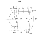 - the lens 110 is arranged in order from the object side to the image plane side without air being sandwiched, and the first lens 111 whose object side surface has a convex shape on the object side, and a transparent body provided with a diaphragm and an infrared cut filter As a glass substrate 112 and a second lens 113.