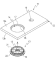 - the horizontal flange 22 is formed in a ring shape orthogonal to the body portion 19 and is directly fitted into the lower groove portion 18 provided on the lower surface side provided around the hole portion 14 of the metal plate 12.