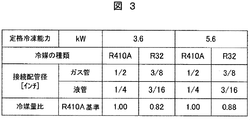 - FIG. 3 shows the connection pipe diameter in the refrigeration cycle apparatus (rated refrigeration capacity 3.6 kW, 5.6 kW) using the refrigerants R410A and R32, which are similar COPs. It is a figure explaining refrigerant