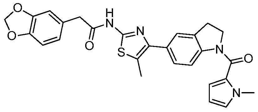 - VTAKJLRKXKDNOF-UHFFFAOYSA-N Cc1c(-c(cc2CC3)ccc2N3C(C2CC2)=O)nc(NC(Cc(cc2)ccc2OC)=O)[s]1 Chemical compound Cc1c(-c(cc2CC3)ccc2N3C(C2CC2)=O)nc(NC(Cc(cc2)ccc2OC)=O)[s]1 VTAKJLRKXKDNOF-UHFFFAOYSA-N 0.000 description 1