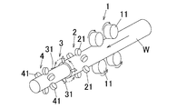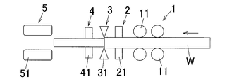 - the upstream roller support machine 2 and the downstream roller support machine 4 include a plurality of upstream support rollers 21 and a plurality of downstream support rollers 41 at equal intervals along the outer circumferential surface of the aluminum bar W in the circumferential direction.