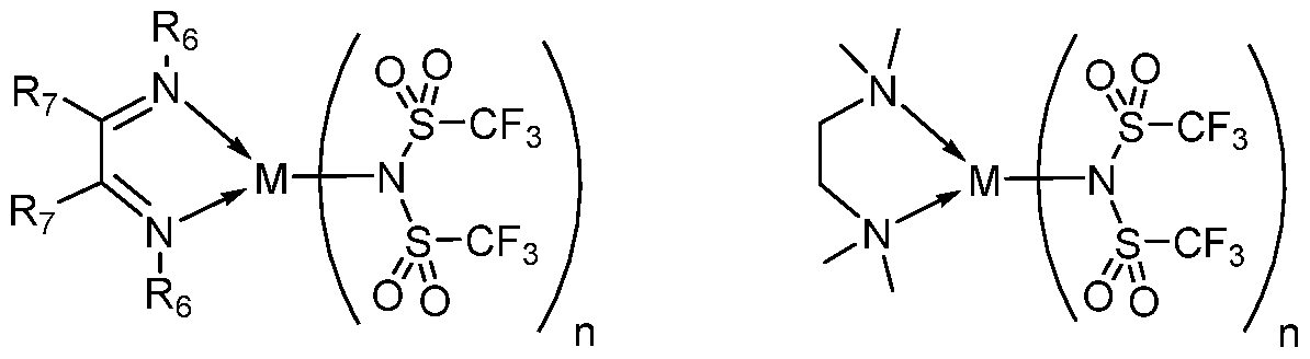 wherein R6 and R7 are independently selected from Ci to C20 alkyl, Ci to C20 heteroalkyl, C6 to C20 aryl, heteroaryl with 5 to 20 ring-forming atoms, halogenated or perhalogenated Ci to C20 alkyl, halogenated or perhalogenated Ci to C2o heteroalkyl, halogenated or perhalogenated C6 to C20 aryl, halogenated or perhalogenated heteroaryl with 5 to 20 ring-forming atoms, or at least one R6 and R7 are bridged and form a 5 to 20 member ring, or the two R6 and/or the two R7 are bridged and form a 5 to 40 member ring or form a 5 to 40 member ring comprising an unsubstituted or Ci to C12 substituted phenanthroline;