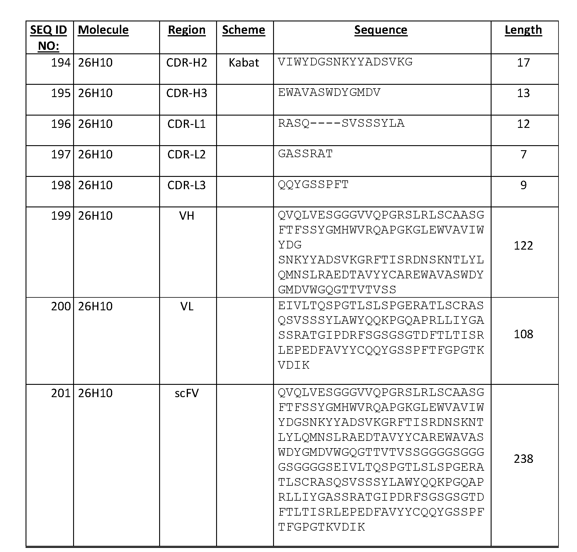 - Table 1 provides the positions of CDR-L1, CDR-L2, CDR-L3, CDR-H1, CDR-H2, and CDR-H3 as identified by the Kabat and Chothia schemes.