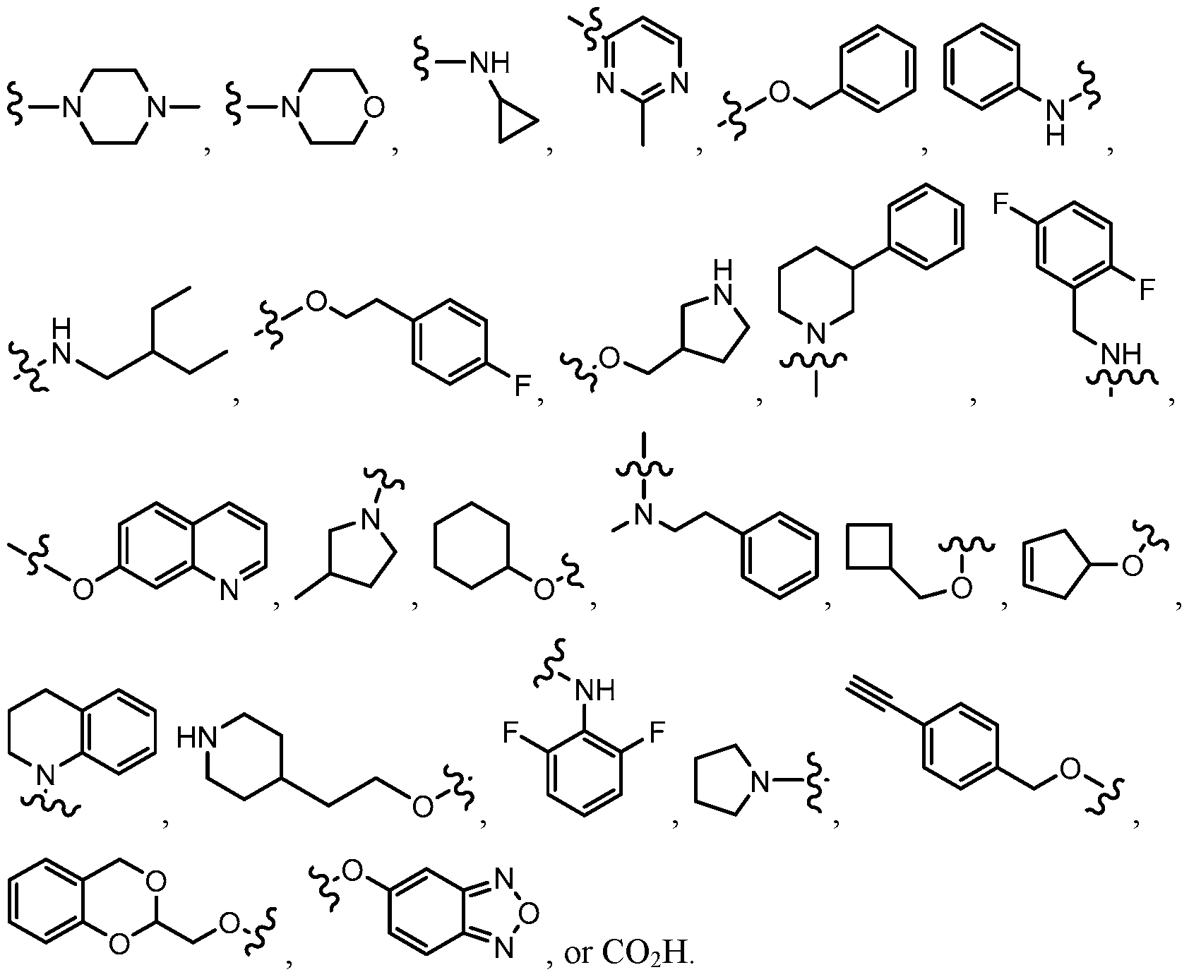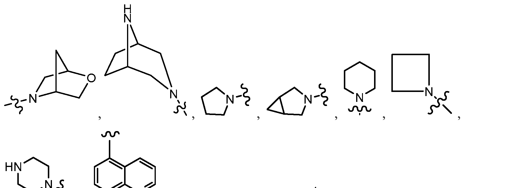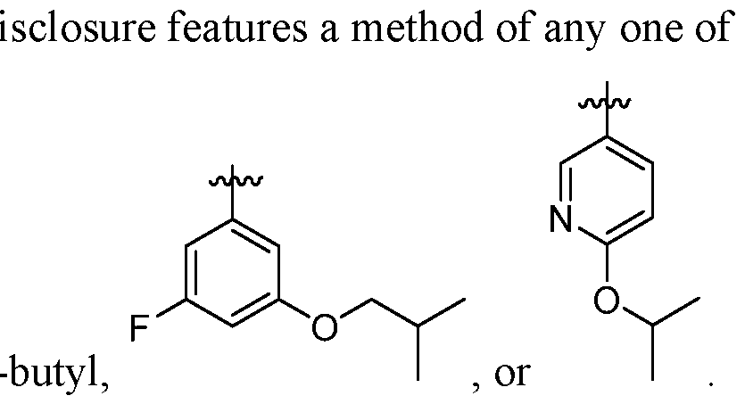 [0032] In some embodiments, each of the specific groups for the variables R1 to R3 can be optionally substituted with one or more groups selected from halo, C3-C6 cycloalkyl, 3-6-membered heterocycloalkyl, phenyl, 5-6-membered heteroaryl, C1-C6 fluoroalkyl, C1-C6 alkyl, C2-C6 alkenyl, C2-C6 alkynyl, CN, hydroxyl, and (C1-C9 alkylene)-E wherein up to 4 CH2 units are independently replaced with O, S, SO2, SO, CO, NH, N-C1-C4 alkyl, N-C2-C4 alkenyl, or N-C2-C4 alkynyl, and wherein E is H, phenyl, C3-C6 cycloalkyl, 3-6-membered heterocycloalkyl, 5-6-membered heteroaryl, C1-C6 alkoxy, CN, or CF3, further wherein each of the phenyl, cycloalkyl,