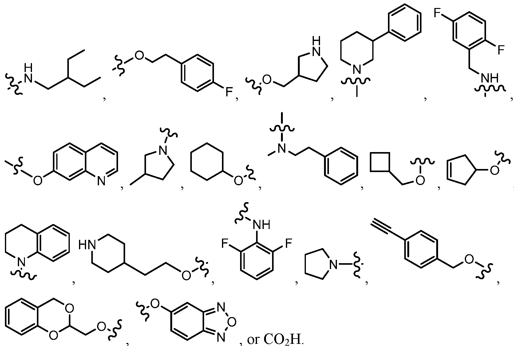 [0033] In some embodiments, each of the specific groups for the variables R1 to R3 can be optionally substituted with one or more groups selected from halo, C1-C6 fluoroalkyl, C1-C6 alkyl, C2-C6 alkenyl, C2-C6 alkynyl, CN, hydroxyl, and (C1-C9 alkylene)-E wherein up to 4 CH2 units are independently replaced with O, S, SO2, SO, CO, NH, N-C1-C4 alkyl, N- C2-C4 alkenyl, or N- C2-C4 alkynyl, and wherein E is H, phenyl, C3-C6 cycloalkyl, 3-6-membered heterocycloalkyl, 5-6-membered heteroaryl, C1-C6 alkoxy, CN, or CF3, further wherein each of the phenyl, cycloalkyl,