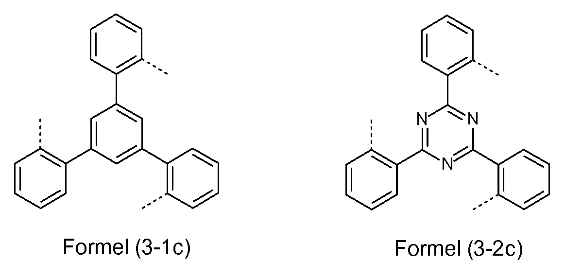 Symbol X enthalten, sind bevorzugt nicht direkt an eine Brücke gebunden, da eine solche Bindung an die Brücke aus sterischen Gründen nicht vorteilhaft ist. Bevorzugt stehen insgesamt maximal zwei Symbole X in CyC für N, besonders bevorzugt steht maximal ein Symbol X in CyC für N, ganz besonders bevorzugt stehen alle Symbole X für CR, mit der Maßgabe, dass, wenn CyC an eine Brücke gebunden ist, ein Symbol X für C steht und die Brücke an dieses Kohlenstoffatom gebunden ist.