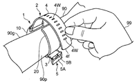 - FIG. 1 shows an external view of a blood pressure monitor of the embodiment (the whole is denoted by reference numeral 1) to which the blood pressure related information display device of the present invention is applied, as viewed obliquely with the belt 2 fastened. Yes.