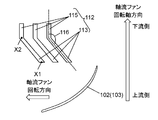 - the straightening vane is not shaped in consideration of the air flow in the suction direction. Rather, the straightening plate resists the air flow in the suction direction on the outer peripheral side of the axial flow fan, and thus causes disturbance of the air flow on the outer peripheral side of the axial flow fan.