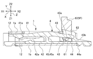 - FIG. 10A is a cross-sectional view of the fourth signal contact 3 held in the housing 1 taken along the XZ plane when the pressing member 6 is in the second pressing member posture.