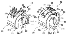- FIGS. 6 to 10 are perspective views and the like showing the connector 10 in an exploded manner. 1 to 5, the open state in which the sealing piece 30 is retracted is shown as (a), and the closed state in which the sealing piece 30 protrudes is shown as (b).