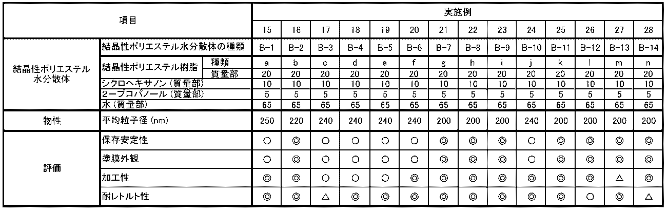 結晶性ポリエステル樹脂水分散体(B-1)の製造と同様にして、結晶性ポリエステル樹脂(b)~(n)、(о)~(x)をそれぞれ使用して、結晶性ポリエステル樹脂水分散体(B-2)~(B-14)、(B-15)~(B-24)を得た。