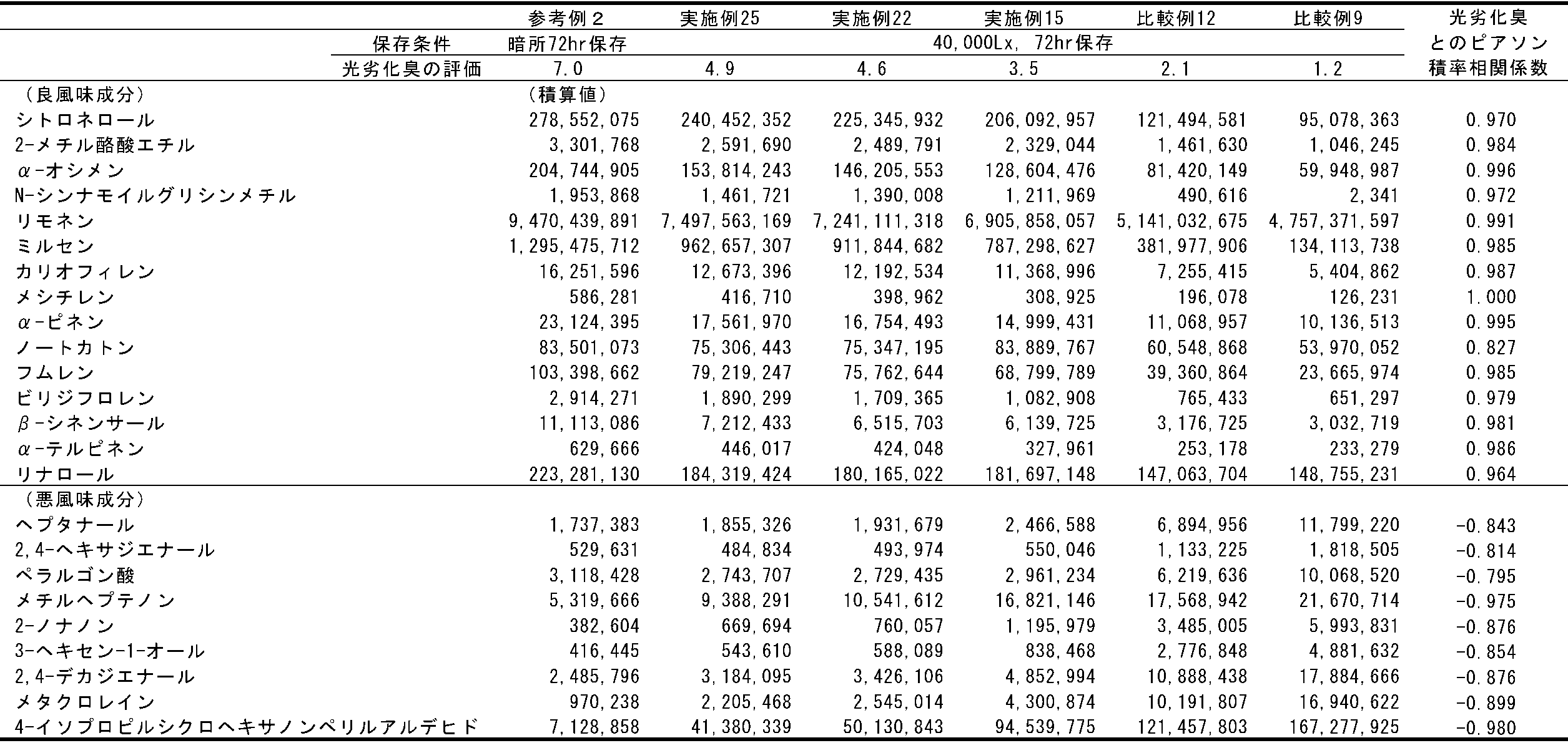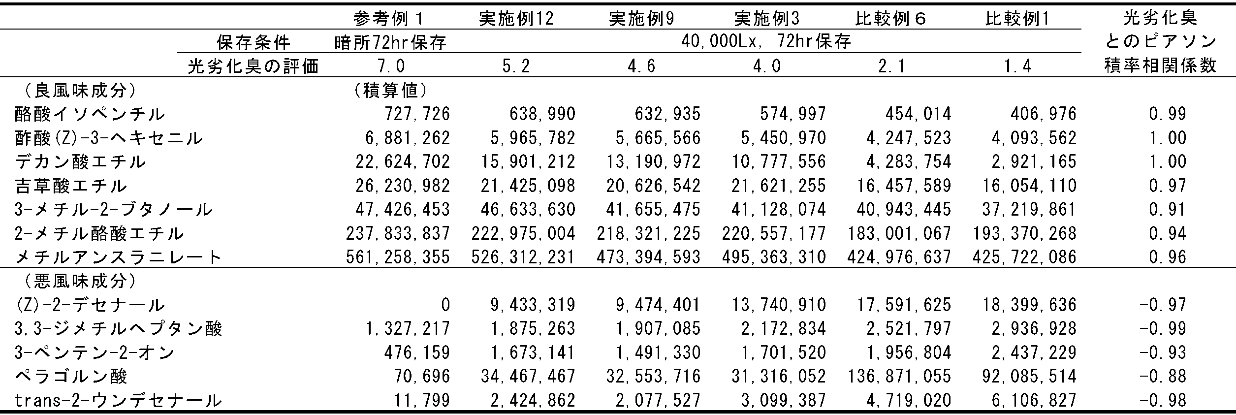- the flavor deterioration inhibitor of the present invention can suppress both the decrease in aroma and the increase in unpleasant odor.
