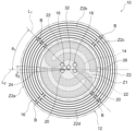 - the multi-zone ceramic heater 10 shown in Figs. 1 and 2 comprises a ceramic plate 12, an inner zone heater circuit 14, an outer zone heater circuit 16, a pair of first power supply terminals 18, a pair of second power supply terminals 20, and a pair of jumpers 22.